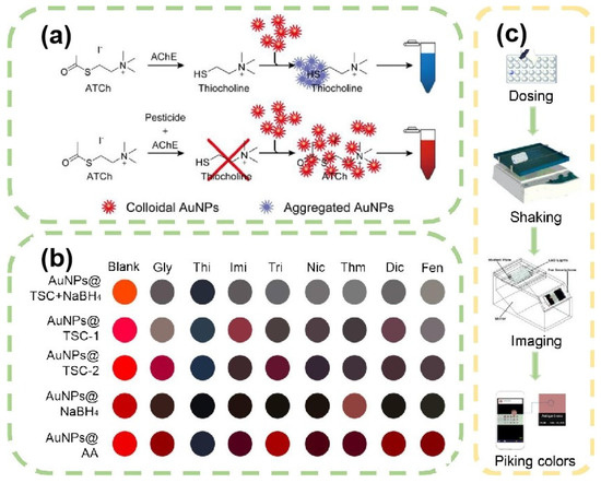 The principle and working process of the AuNP-based colorimetric sensor array for distinguishing multiple pesticides. (a) The mechanism of distinguishing multiple pesticides by combining AChE and AuNP-based colorimetric sensor arrays. (b) The schematic diagram of the colorimetric sensor-array result. (c) The main procedures of the working process are dosing, shaking, imaging, and picking colors. Reproduced from [98] with permission from Elsevier.