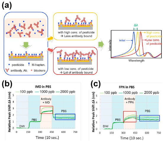 (a) Illustration of the competitive binding immunoassay and the induced signal difference in the SPR peak shift. The blocker used here is 2-mercaptoethanol. Kinetic SPR curves of (b) imidacloprid and (c) fipronil; abbreviations: SPR, surface plasmonic resonance; IMD, imidacloprid; FPN, fipronil; DIW, deionized water; PBS, phosphate-buffered saline. Reproduced from [99] with permission from Elsevier.