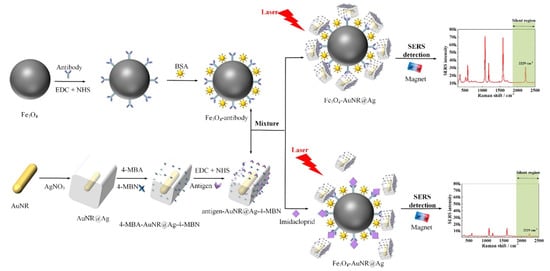 The Surface Enhance Raman Scattering (SERS) technique has received much attention in the field of analysis due to its non-invasive and unique fingerprint characteristics. In particular, the Raman signal can be enhanced with the use of nanomaterials with plasmonic properties, greatly improving the sensitivity of detection. For example, the O’Riordan group [100] proposed a SERS sensor for two neonicotinoids, including clothianidin and IMI, using Ag nanoparticles coated Polyvinylidene fluoride (PVDF) substrates. The developed SERS can sense 1 ng/mL IMI with a LOD of 4 nM. More importantly, in this work, the authors provide the detailed vibrational characteristics of IMI in combination with first-principle simulations. Sun et al. [101] developed a SERS sensor for IMI with a competitive immune strategy (Figure 9). In this work, a Raman tag containing C≡N (1800–2800 cm−1) bond was anchored on an AuNR@Ag nanocuboid to resist the optical interference from the fingerprint region (<1800 cm−1) and an antibody was used to specifically identify IMI. In addition, the Fe3O4 nanoparticles were used to achieve magnetic separation and improve the SERS intensity. This SERS immunosensor can detect IMI at 10–40 nM with high selectivity. Sheng et al. [24] developed a SERS-based lateral flow assay (SERS-LFA) test strip for detection of IMI, chlorothalonil (CHL), and oxyfluorfen (OXY) simultaneously with a competitive immune strategy. In this work, the prepared silver-core, gold-shell (Ag@Au) nanoprobe was used to fix the SERS signal molecule 4-nitrothiophenol (4-NTP), connect antibodies, and enhance the SERS signal. This SERS-LFA test strip gains reliable results with rapid response, high sensitivity, low LOD, and low cost. The detection sensitivity was closely related to the type of SERS base materials.