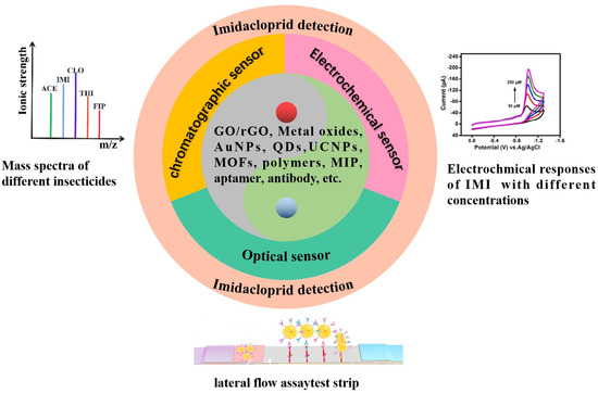 Up until now, various analytical methods have been developed for pesticide detection, including chromatographic techniques, electrochemical methods, and optical methods. Each of them has its own advantages and disadvantages (discussed in detail in Part 3). For example, efficient sample pretreatment methods are required before chromatographic analysis [8]. The weaker electrochemical response of IMI on traditional bare electrodes results in low sensitivity. Introducing nanomaterials into these analytical techniques can overcome these shortcomings. With the advancement of nanotechnology and synthetic methodologies, various nanostructure materials (NMs), including carbon-base materials (graphene, carbon nanotubes, porous carbon, etc.), metal nanoparticles, metal oxides and sulfides, upconverting nanoparticles, metal-organic frameworks (MOFs), conducting polymers, and their composites, have been designed and prepared [9,10,11,12]. These nanostructure materials possess excellent physicochemical and plasmonic properties owing to their small particle size and high surface area. These properties make them an essential part of the field of analytical techniques [13,14,15,16]. Nanomaterials play roles in sensor construction by enhancing catalytic activity, immobilizing biological entities (enzyme, antibody, aptamer, etc.), signal amplification, purification, exaction, and separation [17,18,19,20,21]. This review aims to cover the recent development of IMI sensors by combining these analytical techniques with various nanomaterials (Scheme 1).