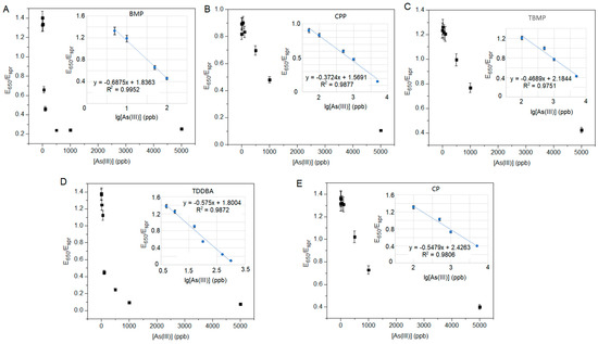 The calibrations of the sensors were conducted with the optimized concentrations of ILs (i.e., the working concentrations listed in Table 2) and different concentrations of arsenite (Figure 4), and E650/Espr was plotted against the logarithm concentration of arsenite (Figure 4 inserts). All five plots (Figure 4 inserts) are linear, with R2 values near to 1.0. the LOD of sBMP was calculated from 3σ, where σ is the standard deviation of the measured three replicates of the lowest concentration of arsenite (Table 3 and Figure 4A). sBMP had a linear detection range of 0.59–100 ppb with an LOD of 0.18 ppb. The LODs and linear ranges of the remaining sensors (sCPP, sCP, sTBMP, sTDDBA, and sCPMI) were not determined in this study. The LOD of the sensor sBMP in this study was 0.18 ppb, which was the second lowest among the reported arsenic sensors (Table 4).