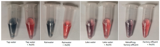 Four real samples (tap water, rainwater, lake water, and MetalProg factory effluent) with or without spiking of 100 ppb As(III) were measured using the sBMP method. All samples were filtered through a 0.22 µm membrane filter. The lake water and MetalProg factory effluent samples were diluted 10 times before use due to a strong matrix effect, while the tap water and rainwater samples were directly tested without further dilution. The tap water and rainwater samples after tests were blue, while the lake water and MetalProg factory effluent samples after tests were not as blue as the former two samples (Figure 6), which could also be due to the remaining matrix effect from the latter two samples even with dilution 10 times. The BMP and AuNP-assisted colorimetric results from all samples with and without spiking of 100 ppb As(III) are listed in Table 5. They agreed well with those determined using inductively coupled plasma-optical emission spectroscopy (ICP-OES). ICP-OES determines the total arsenic concentration, including arsenite and arsenate. It is worth noting that ICP-OES detects total arsenic, while the sBMP sensor detects arsenite species only; hence, it is reasonable that the sBMP sensing results were lower than those from ICP-OES because arsenate could exist in the pristine sample or some amount of arsenite was oxidized by the sample matrix into arsenate. When the total arsenic concentration is to be determined, the sample could be reduced by an appropriate reducing agent, i.e., SnCl2, to convert arsenate to arsenite, which is then determined using sBMP. The difference between the determined values before and after reduction is the concentration of arsenate. Arsenite is more toxic than arsenate. In Table 5, the accuracy of results was not calculated since ICP-OES and sBMP measured different species. In natural sources, the colorimetric results were lower than those from ICP-OES. Apart from the signal from arsenate, other possible reasons could include the facts that (1) the ICP-OES was calibrated using standards prepared in DI water without considering the matrix effect, which caused errors in the ICP-OES results, and (2) some interfering species in the real-world samples interfered with the detection of arsenite ions.