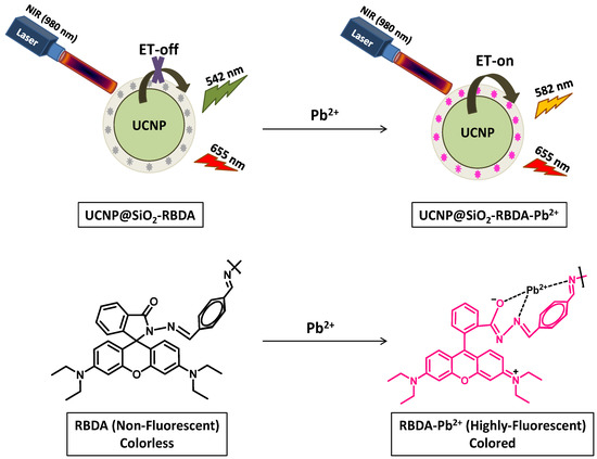 Schematic illustration of the proposed chemosensing mechanism of UCNP@SiO2-RBDA with Pb2+ ions based on ET.