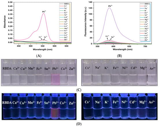 (A) UV–vis absorption (B) Fluorescence emission spectra of RBDA upon the addition of various metal ions (Cs+, Na+, K+, Fe3+, Ni2+, Cd2+, Mg2+, As3+, Ca2+, Cu2+, Mn2+, Fe2+, Sn2+, Co2+, Zn2+, and Pb2+). (C) The visible and (D) fluorescent appearance of the solutions upon the addition of various metal ions, including Pb2+ ions.
