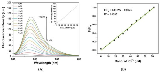 (A) Fluorescence spectra of RBDA upon addition of Pb2+ ions in increasing concentrations (λExe = 525 nm). Inset: Intensity magnitude at 588 nm as a function of Pb2+ ion concentration. (B) The relationship between concentration and the relative fluorescence intensity of RBDA at 588 nm.