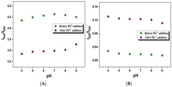(A) Green-to-red emission (GRE) ratios (I542/I655) (B) Yellow-to-red (YRE) emission ratios (I588/I655) at different pH values ranging from 4–9, before (green squares) and after (red circles) the addition of Pb2+ ions (30 μM).