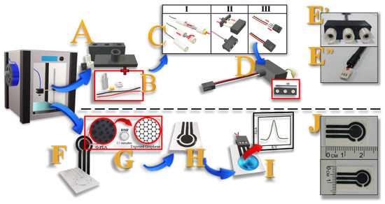Scheme of the proposed connector assembly procedure. (A) 3D-printed parts; (B) electrical connection materials; (C) detailed assembly procedure for (I) female connector, (II) box, and (III) sensor connector; (D) final assembly of the connector; (E′,E″) photos of the connector. Scheme of the procedure for the (F) 3D-printing and (G) DMF chemical treatment performed on the working, counter, and reference electrodes based on PLA and graphene (G-PLA); (H) ready-to-use sensor; (I) coupled to the 3D-printed connector for the voltammetric determination of epinephrine; and (J) photos of the sensor.