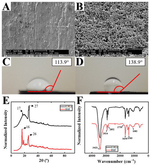 SEM images obtained for (A) untreated and (B) DMF-treated G-PLA electrode surface with 2000× magnification. Image of the contact angle measurements obtained for (C) untreated and (D) treated G-PLA electrodes. (E) XRD and (F) FTIR spectra obtained for untreated (black) and treated (red) G-PLA electrodes.