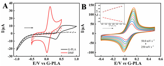 (A) Cyclic voltammograms obtained in G-PLA before (black line) and after surface treatment with DMF (red line) for a 1.0 mmol L−1 FcMeOH solution, and respective blank solutions (0.1 mol L−1 phosphate buffer (pH 7)—dotted lines); and (B) cyclic voltammograms obtained in the presence of 1.0 mmol L−1 FcMeOH at different scan rates (50 to 250 mV s−1) for the additive manufacturing electrode treated with DMF. Inset: Correlation between the anodic peak currents and the square root of the scan rate (v 1/2).