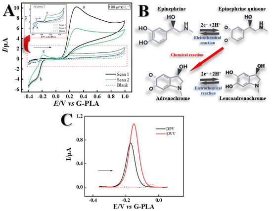 (A) Cyclic voltammograms in the absence (blue line) and presence (black line—scan 1; green line—scan 2) of 100.0 µmol L−1 of epinephrine by using the additive manufacture G-PLA electrode. Supporting electrolyte: 0.1 mol L−1 phosphate buffer (pH 7). Scan rate: 30 mV s−1; Inset: zoom, cyclic voltammograms of 10.0 µmol L−1 of epinephrine. (B) Proposed mechanism for epinephrine redox reaction. (C) Voltammograms obtained by DPV (black line) and SWV (red line) in the absence (dashed lines) and presence (solid lines) of 0.1 mmol L−1 epinephrine. DPV experimental conditions—modulation amplitude: 25 mV; modulation time: 0.05 s; scan rate: 30 mV s−1. SWV experimental conditions—modulation amplitude: 20 mV; step potential: 5 mV; frequency: 6 Hz. Supporting electrolyte: 0.1 mol L−1 phosphate buffer (pH 7).