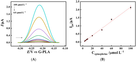 (A) SWV voltammograms for increasing epinephrine concentrations (4.0, 6.0, 8.0, 10, 20, 40, 60, and 100 µmol L−1) and (B) the respective analytical curve (n = 3). Experimental conditions— step potential: 6 mV; modulation amplitude: 60 mV; frequency: 30 Hz. Supporting electrolyte: 0.1 mol L−1 phosphate buffer (pH 7.0).