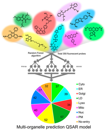 Quantitative Structure-Activity Relationships (QSAR) have been employed in many area to develop mathematical models that predict the behavior of chemicals in biological systems based on their structure and properties [14,15,16,17]. In drug discovery, QSAR models have been generated to predict the activity of new drugs, using only the structure and biological effects of the drugs, even in the absence of information about their biological targets [18,19,20]. Similarly, QSAR can be utilized to develop models that predict the target organelles of new fluorescent molecules. The pioneering works on the organelle selectivity QSAR, reported by R. Horobin and colleagues, utilized the Simplest Chinese Box (SCB) algorithm to make prediction models and found a number of physicochemical parameters that control the entry and retention of probes into certain organelles [9,10,11,12,13,21,22,23,24,25,26]. However, when these parameters were applied to construct a multi-organelle prediction model using a decision tree algorithm, the model provided a low prediction accuracy for certain organelles (41% for lysosome and 45% for cytosol) [27].