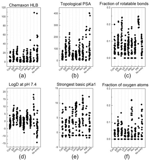 Now, let us discuss a few distinctive and explainable physicochemical properties that apparently affect the organelle specificity of the dyes. Among the 38 descriptors, those regarding the hydrophobicity of probes were found to be involved in the staining of LD and PM. For example, the results of (Chemaxon HLB) and (SlogP Me1) demonstrated that LD-specific probes are the most hydrophobic among all probes (Figure 3a and Figure 4a). The low values of (topological PSA) also indicate that the hydrophobic environment of LD would be preferred by the LD-specific probes (Figure 3b). PM-specific probes also exhibited high hydrophobicity, but the results of (fraction of rotatable bonds) suggest that the flexibility of probes is also an important factor for PM-selective probes (Figure 3c). On the other hand, probes that cannot pass through the PM (no entry) were commonly found to have permanent charges, high hydrophilicity and large polar surfaces, as shown in the results of (topological PSA), (LogD at pH 7.4), and (formal charge) (Figure 3b,d and Figure 4b). The comparative analysis of LD-, PM-, and no entry groups indicate that a variety of hydrophobicity-related properties affect the internalization of the probes into the cells and staining of LD, a typical hydrophobic organelle.