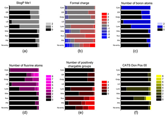 The descriptors that affect the localization of probes into the ER, Golgi, and mito-chondria. (a) SlogP Me1, (b) formal charge, (c) number of boron atoms, (d) number of fluorine atoms, (e) number of positively chargable groups, and (f) CATS Don Pos 00.