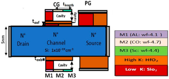 The biosensor in this work is designed as a junctionless device with an asymmetrical hetero-dielectric and triple material [28,29,30,31] control gate. The biosensor cross-section is shown in Figure 1. The dielectric layer consists of two strata of different materials. High-k and low-k dielectric materials are combined in the top gate dielectric’s initial layer, which is followed by a high-k layer. Here, k denotes relative dielectric permittivity. The lower gate, however, only has one high-k layer of 2 nm thick. In addition, a 2 nm spacer is added between the gates for improved isolation. In addition, a triple material gate (TMG) [28,29,30,31], where M1 is aluminum, M2 is cobalt, and M3 is scandium, has the benefit of enhanced gate control and greater carrier mobility, combined with asymmetry in the dielectric for improved performance. The use of high-permittivity material close to the tunneling junction enhances the electric field across the junction, which, in turn, improves the tunneling efficiency and increases the ON current. Similarly to this, using low-k material close to the drain causes the OFF current to drop. Consequently, it has been found that using TMGs with asymmetric hetero-dielectrics considerably improves the current ratio with moderate SS levels. The suggested device is calibrated with a traditional JLTFET [25], as depicted in Figure 2.