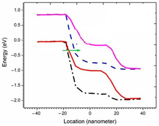 The energy band of the proposed biosensor is shown in Figure 3. As the dielectric permittivity across the cavity increases, the electric field maximizes, and, therefore, the best possible alignment occurs. The dotted line shows the alignment when a dielectric with a permittivity of k = 12 fills the cavity, whereas the straight line shows the situation for k = 1 (air). It was observed that there is less alignment between the bands for a cavity filled with air. If the energy bands that are aligned are higher, the tunneling width decreases, and thus, the probability of carrier tunneling is better. The green arrow in the figure depicts the tunnel width.