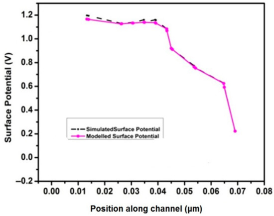 The performance of the proposed structure is validated by comparing it with the existing structures, as shown in Table 2. Similarly, the surface potential model is depicted in Figure 4 for various dielectrics. The variation in the potential along the channel is studied. It was observed that the potential drops across the channel. The step change in the potential profile is due to the use of three different materials across the control gate. The potential profile then drops to zero in the source region. Because of the higher effective capacitance caused by the increased dielectric permittivity, k, the barrier width at the source-channel junction drops, resulting in a rapid rise in the surface potential across the tunneling area. Thereafter, the modeled and simulated values of the surface potential are compared in Figure 5. The graph demonstrates the congruence of the surface potential values between those that were modeled and those that were simulated, thus proving the viability of the suggested model.