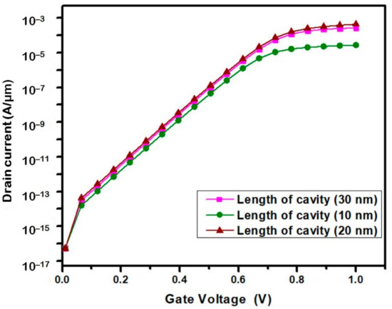 The cavity length varies from 10 nm to 30 nm, keeping k = 12 and the cavity thickness at 5 nm, while the gate voltage is maintained at 1 V and the drain voltage at 1 V. The drain current gate voltage dependence for different cavity lengths is shown in Figure 7. It was observed that, for a length of 10 nm, the current sensitivity is quite low, and if the length increases to 20 nm, the ON current raises. However, if we further increase the length, there is a small decrease in the drain current. Moreover, the OFF current remains almost constant. This behavior is due to the fact that, for a 20 nm cavity, the maximum electric field appears at the tunnel junction, and the energy bands are perfectly aligned. Thus, the maximum number of carriers can tunnel across the junction, resulting in an increase in the drain current. As we further increase the length, the alignment is impaired, and the tunneling reduces. The modeling and simulation results show similar values (overlapping in the figure).