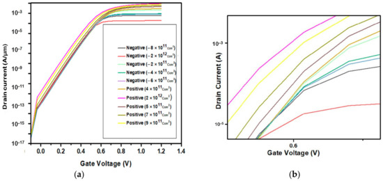The impact of electrically charged (positive/negative) biomolecules in a fully filled nano-gap is depicted in Figure 9. The graph shows that the drain current rises with an increase in positive charges (a left shift of the characteristics), whereas it decreases with an increase in negative charges (a right shift). This can be represented by the MOSFET equation [32]: