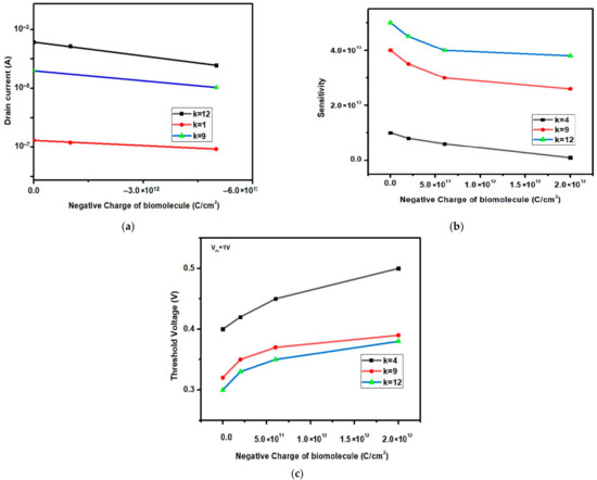 The impact of a negative charge of −1 × 1012 C/cm2 with variation in dielectric permittivity is plotted in Figure 10a. As depicted in Figure 10b, the sensitivity shows a declining trend as the negative charge increases. However, for a fixed charge, the sensitivity increases with k. As shown in Figure 10c, the drain current shifts toward the right with an increase in negative charge, and thus, the threshold voltage increases. However, for a fixed charge, the threshold voltage increases with k. According to Equation (18), for a fixed gate voltage, the surface potential declines with an increase in negative charges, and thus, the current also declines.