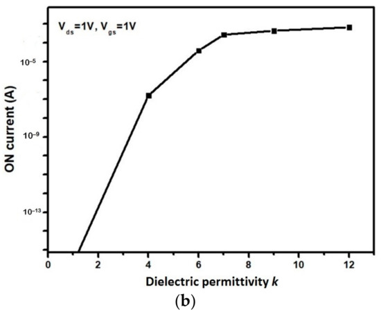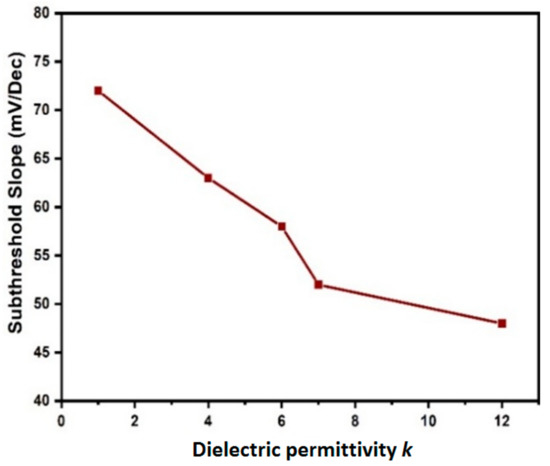 The effect of dielectric permittivity variation on threshold voltage is shown in Figure 14. The threshold voltage is calculated by the constant current method at a 10−7 value for the ON current. We found that the threshold voltage thereby declines with a rise in the k value. As the k value increases; the coupling improves; the band alignment becomes better because of the increased electric field; and, hence, the tunneling probability becomes higher.