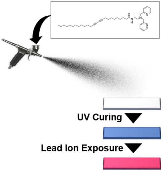 Sprayable sensors have several benefits including the ability to expand chemical sensing to large scale surfaces and to conform to surface contours. Moreover, spray-on sensing materials offer an extremely lightweight coating and are highly flexible, a characteristic that may be particularly appealing for responsive wearable sensing. Spray-on responsive materials represent a new class of sensor that have only recently been explored. Our group, for instance, was the first to demonstrate the use of stand-alone sprayable polydiacetylene formulations for the colorimetric detection of environmental stimuli including chemicals, temperature, or radiation [7]. It is important to distinguish the approach described here from that of manufacturing processes found in many electronic sensors which spray materials as but one step within a multi-step device fabrication scheme. Spray-coating of conducting polymers like PEDOT:PSS have been carried out using stencils in order to deposit patterns as recently demonstrated [8]; however, the spray-on material alone does not provide a fully functional strain sensor, but requires additional components, such as copper wire. Similarly, spray-fabrication of carbon nanotubes has been widely used to create conductive coatings, but these do not function as stand-alone sprayable sensors [9]. In contrast, purely sprayable materials for sensing, on which there is relatively little research, include: fluorescent nanocomposite inks for fingerprint detection [10], FITC-linked aminoethylcellulose particles for pH detection [11,12], porphyrin/coumarin based dye-embedded polymeric nanoparticles for oxygen detection [13], and porphyrin-embedded mesoporous fluorescent particles for pressure detection [14,15], among others. A common feature of such sprayable sensors is the ability of the optical properties to change in the presence of a given stimuli, whether that is a physical or chemical target response. Here we demonstrate that sprayable polydiacetylene-based sensor formulations can provide customizable detection of a target chemical of interest by tailoring the specificity of the pendant side-chain head-group. In this work, we demonstrate a sprayable sensor formulation, which, when coated onto a surface, facilitates a color change for detection of the presence of lead ions in solution. Lead is a toxic heavy metal known to impact brain development, among other health concerns [16,17,18]. Because unknown exposure through contamination of soil or water could affect public health, development of sensor technologies for the detection of lead ions is of high importance. A variety of methods to modify the head group of pendant side-chains for development of polydiacetylene-based color-responsive materials used in lead detection have been reviewed in literature [19]. In this work, we utilize one such compound that utilizes the dipicolylamine moiety as appended on polydiacetylenes to selectively detect lead ions. Previously, this has been demonstrated in a liposomal formulation [20], but here it is presented as a spray-on sensing material for lead detection. The tridentate dipicolylamine moiety has been well documented for the formation of coordination complexes with various metal ions [21], and for use in a number of different sensing applications, by conjugation with fluorescent reporters [22,23,24,25,26,27,28]. In this work, a simple and robust spray-on system can provide detection of the presence of lead ions in a “turn on” color change from blue to red that can be readily observed. As outlined in the schematic below (Figure 1), a formulation comprised of dipicolylamine-terminated diacetylene-containing amphiphiles can be spray-coated onto a substrate (such as paper to provide test strips) and UV-cured to provide a sensor that reveals a visible color change when placed in solutions containing lead ions. While the spray-coating could be applied to most surfaces, here we implemented spraying onto paper substrate to enable a simple color-changing test strip sensor analogous to how ‘litmus paper’ is used for submersion in its testing process. Such disposable sensors can provide accessible information to the wider world at low cost and greater efficiency than biosensors implementing complex measurement techniques [29]. Below, we describe the first spray-on sensor for detection of lead ions, provide details regarding optimization of its color response, and examine its detection limit and selectivity when implemented on a paper substrate. Due to its low cost, this could serve as a model for a widely deployable and disposable sensor.