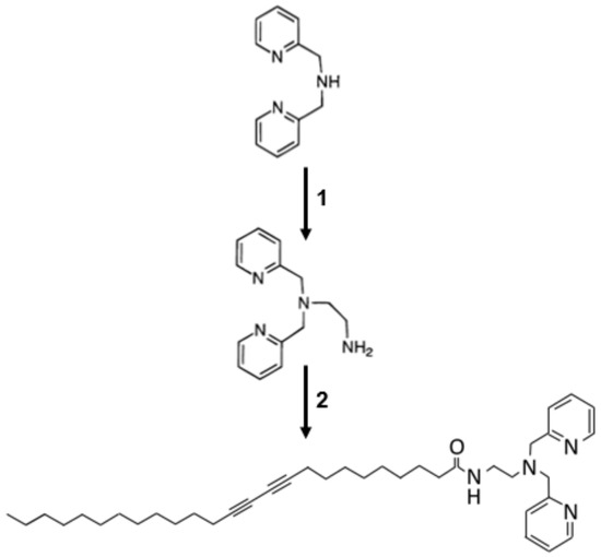 Synthesis of dipicolylamine-terminated diacetylene-containing amphiphile in this work follows a modification of previous reports and is depicted in Figure 2 [30,31]. Unless otherwise noted, reagents were obtained from Sigma Aldrich Co. (St. Louis, MO, USA). In the first step, synthesis of (2-aminoethyl)bis(2-pyridylmethyl)amine was carried out via initial formation of N-(2-(bis(2-pyridylmethyl)amino)ethyl)-phthalimide which was conducted at 10 mmole scale, specifically, 1.4 mL of triethylamine (Fisher Chemical, Waltham, MA, USA) and 2 g of N-(2-bromoethyl)phthalimide (Acros Organics, Morris Plains, NJ, USA) were added to a mixture containing 1.8 mL of di-(2-picolyl)amine (TCI, Tokyo, Japan) in 20 mL of toluene. This was mixed overnight under nitrogen and underwent reflux with heating at 60 °C. The solvent was then removed using a rotary evaporator (Heidolph Instruments, Schwabach, Germany) until a viscous red oil could be obtained. This red oil was washed with 40 mL of cold water and 40mL of cold diethyl ether, followed by vacuum filtration using a Buchner funnel to obtain a solid product, which was completely dried to obtain the N-(2-(bis(2-pyridylmethyl)amino)ethyl)-phthalimide as a beige solid. Using 1 g of the N-(2-(bis(2-pyridylmethyl)amino)ethyl)-phthalimide, it was dissolved in 20 mL of ethanol and to it added 400 μL of hydrazine monohydrate. This mixture was refluxed under nitrogen at 80 °C for approximately 4 h for the complete formation of a white, gelatinous precipitate. To the mixture, 2 mL of 12 M HCl was added followed by additional heating at 80 °C for 2 h. The resulting suspension was filtered using a Buchner funnel; the filtrate was collected and concentrated under vacuum for removal of ethanol. The collected product was mixed with approximately 12 mL of 1 M NaOH, and the resulting mixture was extracted with diethyl ether. The ether phase was collected and evaporated to obtain the (2-aminoethyl)bis(2-pyridylmethyl)amine in the form of a yellow oil.
