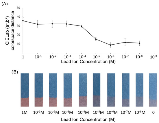 (A) CIELab (a*, b*) distance for lead sensor strips exposed to serial dilutions of lead nitrate in 10mM HEPES (pH 7.5). (B) Images of test strips after partial submersion in lead nitrate solution of respective concentrations for 5 min.