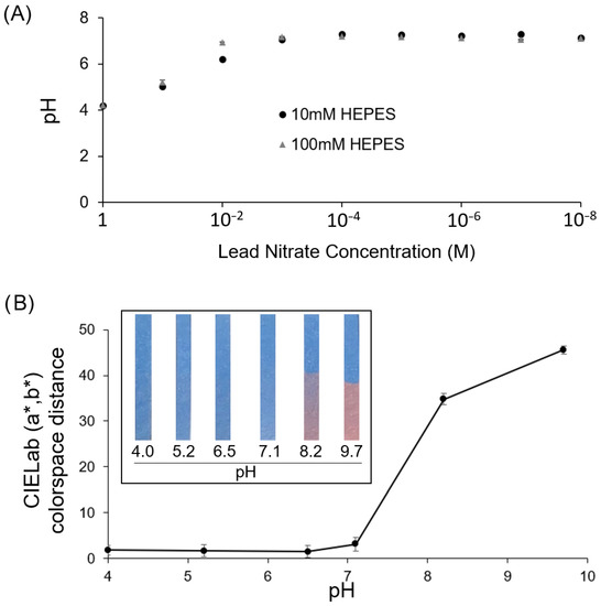 To determine if the response of the sensor in the presence of lead was due to changes in pH caused by high concentrations of lead nitrate, we examined both the effect of lead nitrate concentration on pH and the effect of pH on the color of the spray-on sensor strips. For this, 10 mM HEPES buffer and 100 mM HEPES buffer were prepared at pH values of 4.0, 5.2, 6.5, 7.1, 8.2, and 9.7. The spray-on sensor strips, prepared as described above, were partially submerged for 5 min in the 10 mM HEPES buffers of the specified pH values, and the color response was once again determined based on the CIELab (a*, b*) colorspace distance.