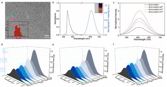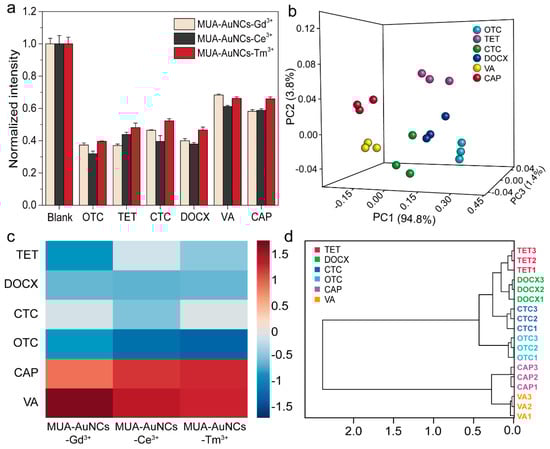 To study the possible response mechanism of the sensor array, the UV–Vis absorption spectra of MUA-AuNCs and six antibiotics (OTC, TET, CTC, DOCX, VA, and CAP) were measured. The selected six antibiotics had various absorbance in the range of 200–400 nm (Figure 2a), thus we speculated that the competitive absorption of these antibiotics to the excitation light can effectively quench the emission of MUA-AuNCs, which meant that IFE was a possible detection mechanism of the sensor array. Specifically, the UV–Vis absorption of MUA-AuNCs was approximately 250 nm, the UV–Vis absorption of TCs was in the range of 200–400 nm, while VA and CAP have maximum UV absorption approximately 290 nm and 280 nm, respectively. Since the UV absorption curves of MUA-AuNCs and the antibiotics showed various degrees of overlap, it indicated that IFE was indeed the main reason for the weakening of the fluorescence of MUA-AuNCs-Re3+, which verified our previous conjecture. Moreover, we found that the UV–Vis absorption spectra of these antibiotics did not overlap with the previously measured fluorescence emission spectrum of MUA-AuNCs approximately 610 nm, so fluorescence resonance energy transfer (FRET) was not the sensing mechanism of this sensor array. Among them, the absorption bands of the four kinds of TCs and MUA-AuNCs overlap greatly, corresponding to the strongest fluorescence quenching efficiency of TCs.