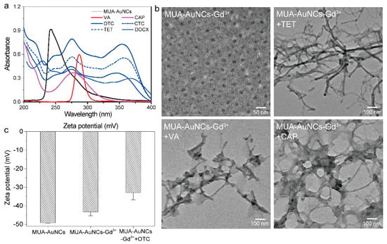 (a) UV-Vis absorption spectra of MUA-AuNCs and six antibiotics (OTC, TET, CTC, DOCX, VA and CAP). (b) TEM of MUA-AuNCs-Gd3+, and after the addition of TET, VA and CAP, respectively. (c) Zeta potential of MUA-AuNCs after mixed with Gd3+ and OTC.