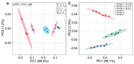 To further explore the ability of the sensor array to discriminate the antibiotic mixtures, binary mixtures of OTC and CTC with different molar ratios (total concentration of 100 μM, OTC:CTC = 10:0, 7.5:2.5, 5:5, 2.5:7.5 and 0:10, respectively) were prepared as samples, and then the fluorescence responses of the sensor array towards these mixture samples were recorded and analyzed. As illustrated in Figure 5a, the mixtures of the binary antibiotics with different molar ratios were clustered in different groups in the 2D PCA plot, and a good distinction was obtained. It was obvious that the different elliptical confidence regions in the plot were arranged in accordance with the molar ratio. These results suggested that the MUA-AuNCs-Re3+ sensor array has the potential to distinguish antibiotics from complex components.