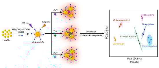 To date, various methods for the antibiotic detection have been established, such as enzyme-linked immunoassay [12], high-performance liquid chromatography [13], capillary electrophoresis [14], colorimetry [15], high-performance liquid chromatography–mass spectrometry [16], and the fluorescence method [17,18,19]. Among these methods is the fluorescent technique, with the advantages of simplicity, rapidity, high sensitivity and low cost, and is one of the most promising methods for the antibiotic detection. The fluorescent sensor array not only has the above advantages, but can also be applied to multi-target recognition. For instance, a lanthanide-based fluorescent sensor array, named “chemical tongue”, was reported to detect eleven heavy metal ions, in which the fluorescence of the probes was quenched to different degrees by different metal ions [20]. Huang and co-workers [21] have built a pH-regulated paper-based sensor array for quantitative identification of antibiotics. Sun et al. [22] reported a carbon dots-based fluorescent sensor array for phosphate detection and discrimination. In summary, fluorescent sensor arrays have broad application prospects in identifying and discriminating multiple analytes. In the past two decades, due to strong photoluminescence, a large Stokes shift, low toxicity, good photostability and biocompatibility [23,24,25], metal nanoclusters [26], such as gold nanoclusters (AuNCs), have become one of the most ideal luminescent materials in the field of sensing and imaging [27,28,29]. Many AuNCs-based sensor arrays have been developed to identify different proteins and bacteria [30], three nitrophenol isomers [31], various amino acids [32], seven heavy metal ions [33], etc.