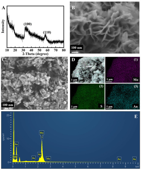 The XRD result of the prepared MoS2 is exhibited in Figure 1A. The diffraction peak at 32.6° and 58.3° corresponded to (100) and (110) crystal planes, respectively, which belonged to hexagonal MoS2 (JCPDS 37-1492) [47,48,49]. In addition, the morphology of MoS2 was characterized by SEM. Observed from Figure 1B, the MoS2 nanoflowers were stacked by MoS2 nanosheets. The flower-like MoS2 also had some stacking. Flower-like MoS2 provided abundant sites to load Au nanoclusters (Au NCs) and catalyze the decomposition of H2O2. The raspberry-like Au NCs are exhibited in Figure 1C. Au NCs anchored on the MoS2 nanozyme were composed of Au nanoparticles. In addition, the diameter of Au NCs ranged between 45 nm and 100 nm, which were employed to immobilize Ab2. As shown in Figure 1D(1–3), three elements were presented in the sample: Mo, S, and Au. Figure 1C–E clearly show that the three elements were distributed evenly in the complex nanozyme. In brief, the above analyses demonstrated that the MoS2@Au nanozyme was synthesized successfully. Moreover, the characterization of the peroxidase-mimetic activity of MoS2@Au and the i–t curve are shown in Figure S1.