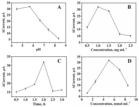 In order to obtain the optimum analytical performance of the immunosensor, this work optimized the pH of the PBS solution (4.5, 5.7, 6.6, 7.4, and 8.3), the concentration of rGO-TEPA (0.5, 1.0, 1.5, 2.0, and 2.5 mg·mL−1), and the incubation time of the NSE antibody and NSE (0.5, 1.0, 1.5, 2.0, 2.5, and 3.0 h). In the process of optimization, the immunosensors were fabricated with 1 ng·mL−1 of NSE. Under acidic conditions, MoS2 owns a fine electrocatalytic activity; however, the NSE and NSE antibody can only maintain excellent stability under near-neutral conditions [31]. In order to obtain the optimal pH value, a PBS buffer solution in the pH range of 4.5 to 8.3 was configured for detecting NSE. The measuring result is shown in Figure 2A, and the optimum amperometric response occurred at pH 5.7. Hence, a PBS buffer solution with pH 5.7 was selected for the subsequent study.