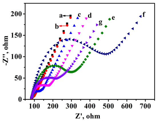 EIS recorded from 1 to 105 Hz for bare GCE (a), GCE/rGO−TEPA (b), GCE/rGO−TEPA/GA (c), GCE/rGO−TEPA/GA/Ab1 (d), GCE/rGO−TEPA/GA/Ab1/BSA (e), GCE/rGO−TEPA/GA/Ab1/BSA/NSE (f), and GCE/rGO−TEPA/GA/Ab1/BSA/NSE/MoS2@Au−Ab2 (g).
