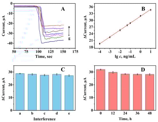 The Stability of the proposed immunosensor was tested. As shown in Figure 4D, after 12 h at 4 °C, the amperometric response clearly decreased. However, the amperometric response decreased tardily as the storage time increased, and 48 h later, the amperometric response dropped to 87% of the initial amperometric response. Those above showed that the immunosensor owned certain stability in 48 h.