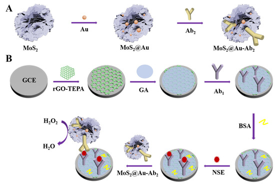 The fabrication process of the immunosensor is shown in Scheme 1B. First of all, aluminum oxide powder, with sizes of 1.0, 0.3, and 0.05 μm, was employed to polish glassy carbon electrodes (GCE), while rinsing the powder off GCE with ultrapure water. Subsequently, the bare GCE was modified by rGO-TEPA suspension (6 μL). A total of 40 min later, GA (6 μL, 2.5%) was dropped onto the modified GCE and kept for 1 h. Afterward, Ab1 (6 μL, 10 μg·mL−1) was introduced onto the above modified GCE, while incubating at 4 °C for 1.5 h. After that, 1% BSA was present on the surface of electrodes to stem the nonspecific binding sites. After reacting at 4 °C for 1 h, the electrodes were modified by different concentrations of NSE and stored at 4 °C for 2 h. Ultimately, the MoS2@Au-Ab2 bioconjugate was introduced onto the surface of the modified electrodes with incubating at 4 °C for 2 h. Whereafter, the electrodes were rinsed and then dried for measuring subsequently.