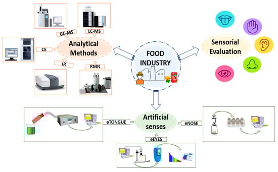 Currently, in the food industry, organoleptic profile (appearance, color, texture, flavor, and taste) is based on the examination of a product through the evaluation of the attributes perceptible by the five sense organs (sight, touch, smell, taste, and hearing) []. As such, they play an important role in evaluating the food quality, developing new products, and establishing standards to determine the acceptability of products by consumer perception. For example, the presence of a bad taste, odor, or color changes due to a lack of efficient control and monitoring systems in food production, is evidence of food insecurity which can reveal a problem for both consumption and commercialization of the products [,]. However, the analysis based on the sense organs (sensory analysis) is a subjective method because it depends on the perception of the consumer; for instance, one person may describe a sample as unpleasant while another may consider the selection acceptable [,]. This variation in food perception is based on distinctive food cues, cultural background, habits, social environment, and emotions []. That is why, in order to obtain more objectivity in sensory analysis, a group of panelists must be trained to acquire a level of sensory acuity and to provide reproducible results [,]. However, sensory evaluation has some disadvantages as it is often time-consuming, expensive, inappropriate for timely measurements, inconsistent, and unpredictable due to various human factors. Furthermore, training sensory panelists can be complicated as protocols and training parameters should be carefully designed based on a food matrix, and any possible variations between samples caused by formulation, processing, packaging, and storage conditions of the food in question should be taken into consideration [,].