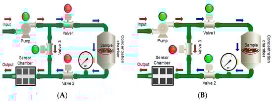 Measurement diagrams: (A) measurement chamber cleaning phase and (B) measurement phase with the E-nose system.