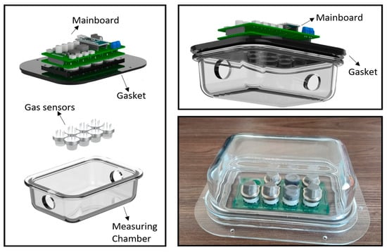 It should be clarified that there was not contamination risk in the electronic components as the mainboard was coupled outside with a gasket placed on the lid of the measuring chamber. Consequently, only the sensor array was exposed to the gas emitted by the sample inside the measuring chamber (see Figure 5). The three eNose2 compartments are connected via a 6 mm outer diameter (4 mm inner diameter) polyvinyl chloride (PVC) pipe.