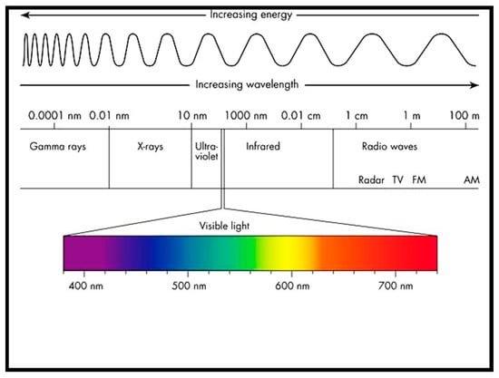 - Franson, J. Electromagnetic Spectrum, Principles of Structural Chemistry. Available online: https://sites.google.com/a/coe.edu/principles-of-structural-chemistry/relationship-between-light-and-matter/electromagnetic-spectrum (accessed on 10 January 2023).