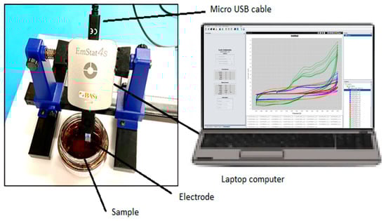 The electronic tongue system, called eTongue, is an EmStat 4S potentiostat by PalmSens and was used in voltammetric mode with different machine learning methods to classify herbal teas. As shown in Figure 10, the device uses a commercial disposable electrode that integrates the working electrode (WE), reference electrode (RE), and counter electrode (CE) into one strip. In addition, the device comes with its own software, PSTrace, that can perform a wide range of experiments from linear sweep voltammetry to square wave voltammetry, electrochemical impedance spectroscopy, etc.