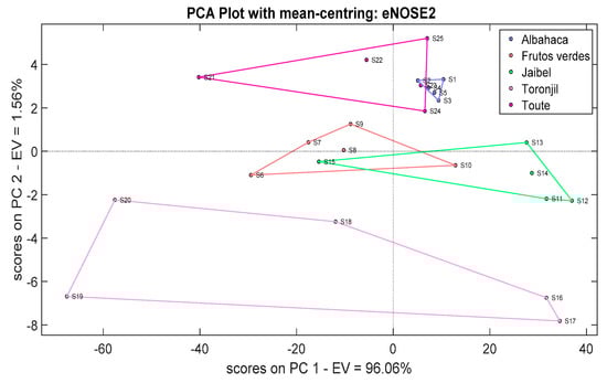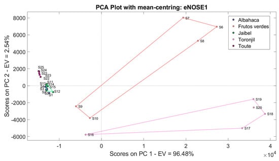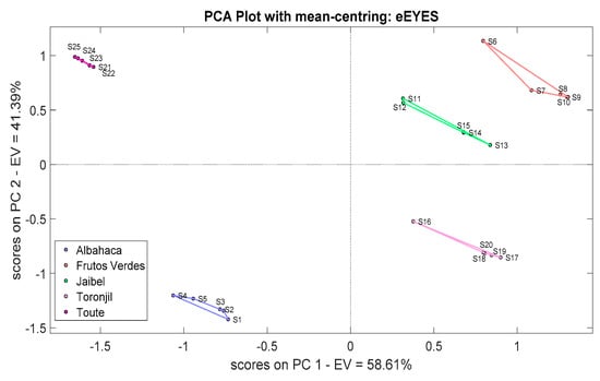 The principal component analysis technique is normally applied to study the relationships that occur between a set of correlated variables (that measure common information) where a set of original variables is transformed into another set of new uncorrelated variables, which are called principal components (PCs) []. These variables are linear combinations and are built given an order of importance, taking into account the captured variance. Therefore, it can be a supervised and unsupervised pattern recognition technique, where the main objective is to reduce the dimensionality of a set of measurements from a given number of variables. This is possible by projecting the input data onto the directions of maximum variance using an orthogonal projection of its principal components onto a dimensional plot. In this study, PCA was mainly used to discriminate the measurements and obtain the “scores” as an input matrix applied to the machine learning or classification methods [].