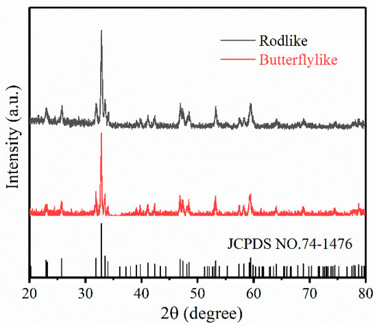 Figure 1 shows the XRD results of the obtained rodlike GdFeO3 and butterflylike GdFeO3 materials. The samples were well crystallized into an orthorhombic phase, as the diffraction peaks were intensive, narrow, and matched well with the standard card (JCPDS No. 74-1476) with a perovskite structure.