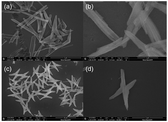 Figure 2 shows the SEM images of GdFe(CN)6·4H2O precursors and GdFeO3 with the morphologies of rod and butterfly. The precursor with a rod structure had a diameter of 109.3 nm and a length of 1.536 μm, with smooth surface characteristics (Figure 2a). After calcination, the GdFe(CN)6·4H2O rods changed into GdFeO3. Figure 2b shows that the GdFeO3 was still a rod-shaped structure. Its diameter and length underwent no significant change compared with the precursor. However, the surface of GdFeO3 was rougher, due to the gaps and cavities between GdFeO3 nanoparticles caused by the annealing process. This form of GdFeO3 can provide abundant active sites, enhance gas-adsorption capacity, and improve the gas-sensing performance of the material. Figure 2c presents the butterflylike GdFe(CN)6·4H2O precursor, with a length of about 6.208 μm and a thickness of 359.9 nm. The butterflies have a multi-level structure, so the surfaces around them are not very smooth. The GdFeO3 synthesized from the butterfly-shaped precursor was the shape and size as the precursor. However, the surface of the particles became rougher (Figure 2d). The GdFeO3 butterfly did not exhibit obvious porosity, which is unfavorable for gas-sensing performance.