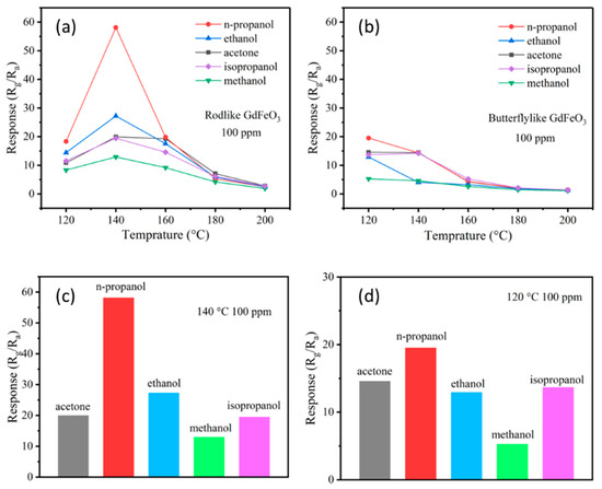 The relationship between temperature and response to 100 ppm different gases of the sensors based on GdFeO3 rods (a) and GdFeO3 butterflies (b). The selectivity of the sensors based on GdFeO3 rods (c) and GdFeO3 butterflies (d).