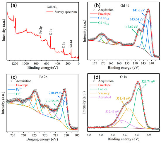 XPS survey (a) and high-resolution scan of Gd (b), Fe (c) and O (d) elements of GdFeO3 rods.