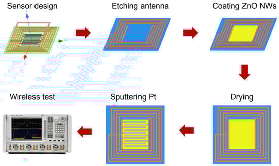 The schematic diagram of the manufacturing process of the LC gas sensor is shown (Figure 2). The inductor was processed on an FR4 substrate with the etching method to obtain the LC antenna after ultrasonic cleaning for 10 min. Subsequently, the as-prepared ZnO NWs were homogeneously dispersed in a proper amount of absolute ethanol in an ultrasonic cleaner for 5 min to form the sensing slurry, which was then coated on the FR4 substrate to form a sensing layer with a thickness of approximately 100 μm. Then, the substrate with the ZnO NWs was placed in an oven for drying at 60 °C. After natural cooling, a plasma sputtering device was used to sputter platinum electrodes on its surface. Finally, the LC sensor was aged at 210 °C for 6 h.