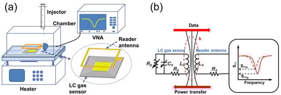 (a) Schematic diagram of the wireless gas sensing measurement setup; (b) equivalent circuit of the wireless gas sensing measurement.